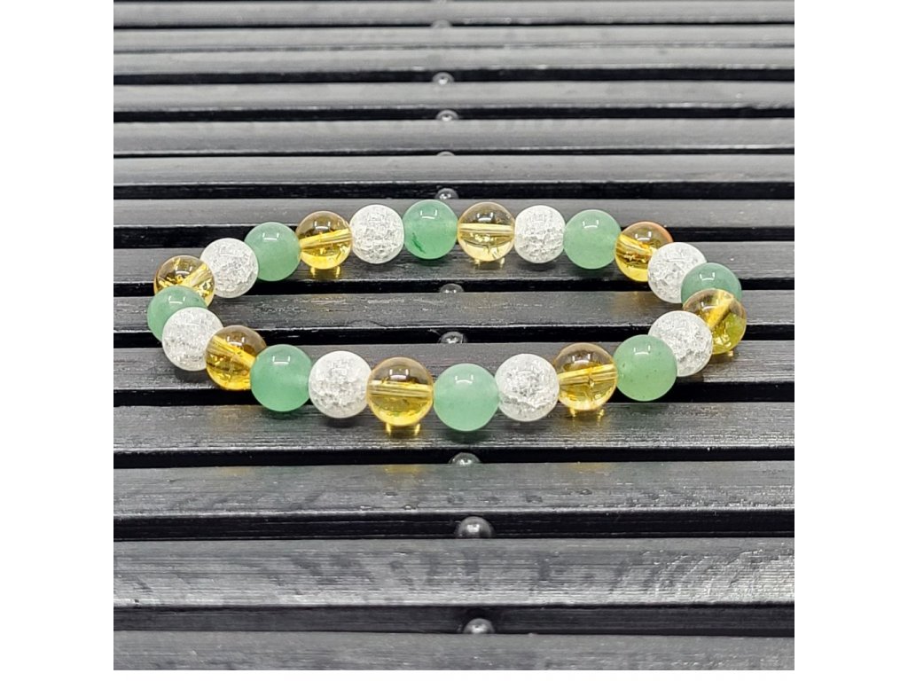 Náramok na prosperitu zložený z citrínu, zeleného aventurínu a kryštálu praskaného. Vynikajúci na prilákanie prosperity, bohatstva a hojnosti. Citrín je posilňujúci kryštál s vysoko vibračnou pozitívnou energiou. Citrín je kameň hojnosti. Priťahuje bohatstvo a prosperitu, úspech a všetky dobré veci do života. Skvelé dobíjanie energie, revitalizuje myseľ. Aventurín je kameň príležitosti, známy pre zosilňovanie šťastia, prosperity a hojnosti. Silná energia kryštálu odstraňuje blokády a obmedzenia, nahrádza lenivosť a nedostatok motivácie silným a neochvejným odhodlaním.